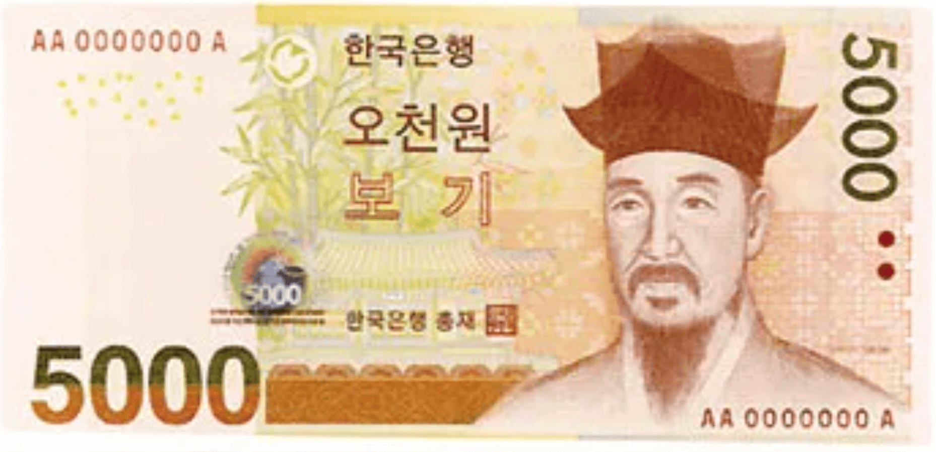 2016년에 발행이 중단된 구권의 경우 연두색입니다. 지금 사용하는 지폐가 더 색이 선명한 느낌입니다.