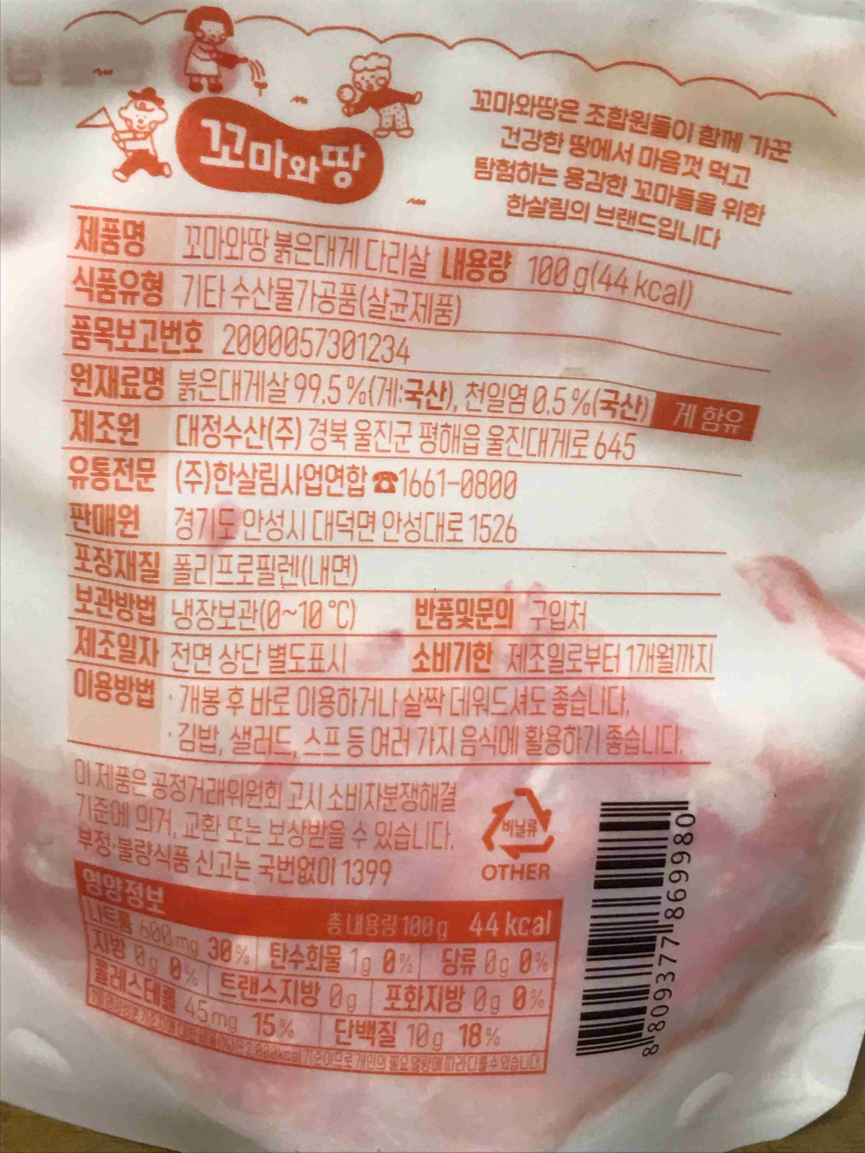 붉은 대게살도 꼬마와땅 브랜드가 붙은 제품입니다.