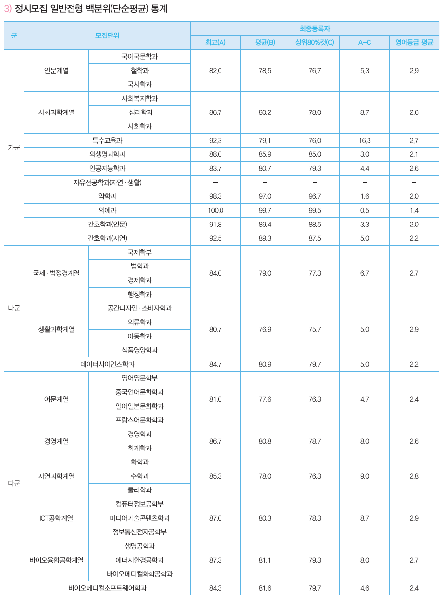 메디컬 계열이 아닌 학과들의 경우 국어, 수학, 탐구에서 백분위를 활용합니다.