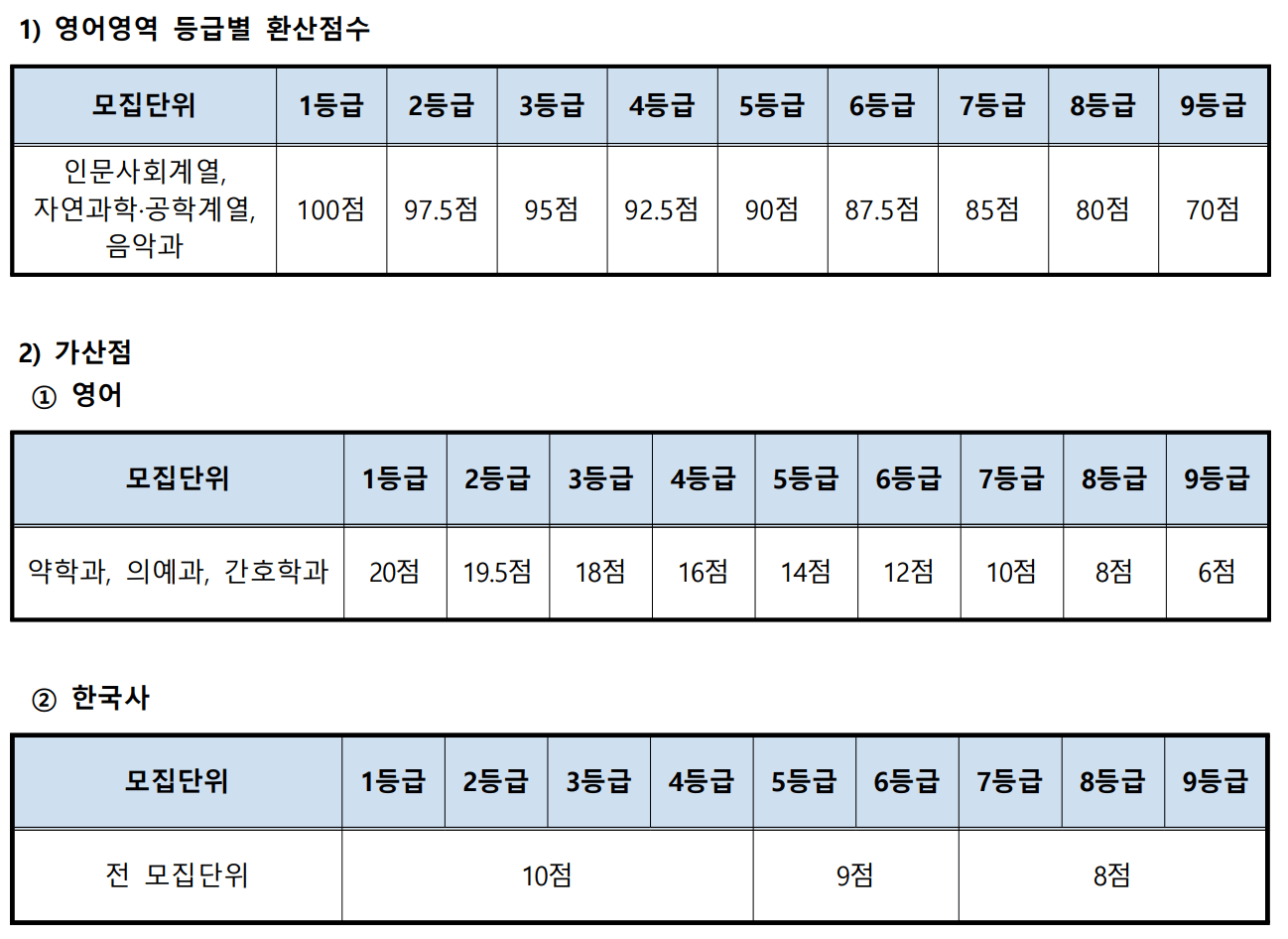 약학과, 의예과, 간호학과의 경우 등급별로 가산점을 부여하는 방식입니다.
