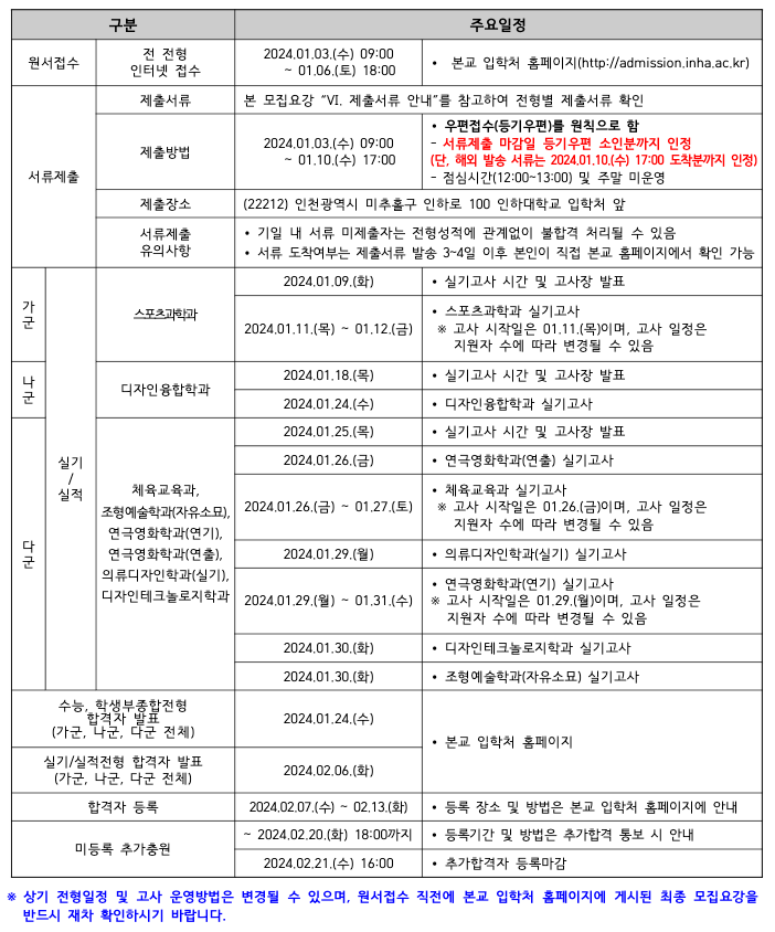 2024학년도 인하대학교 정시 원서접수기간, 실기고사 일정, 합격자 발표 일정을 알아보겠습니다. 그런 다음 전년도인 2023학년도 정시 예비번호 충원율을 살펴보겠습니다.
