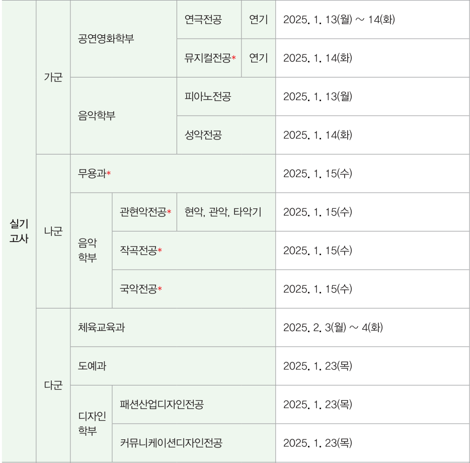 일반적인 학과들은 정시에서 면접, 실기고사 없이 수능 성적만으로 합격 여부가 결정됩니다. 예체능 계열 학과의 경우 아래와 같이 대학별 고사가 진행됩니다.