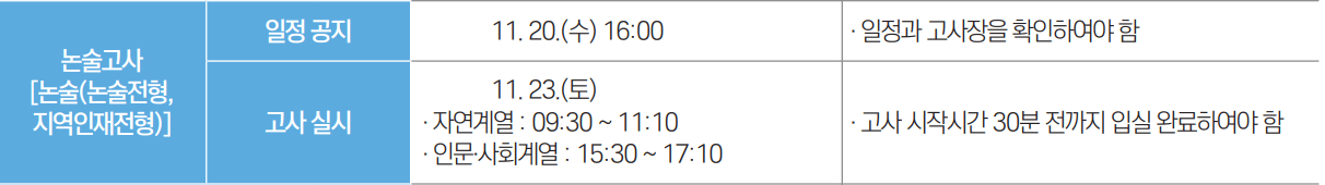 논술고사는 11월 23일(토)에 진행됩니다. 고사장은 11월 20일(수)에 공지되었습니다.