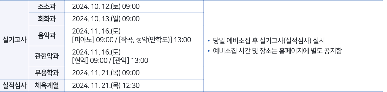 실기고사 일정은 아래와 같습니다. 무용학과의 실기고사는 11월 21일(목) 오전 9시, 체육계열의 실적심사는 11월 21일(목) 오후 12시 30분에 진행될 예정입니다.